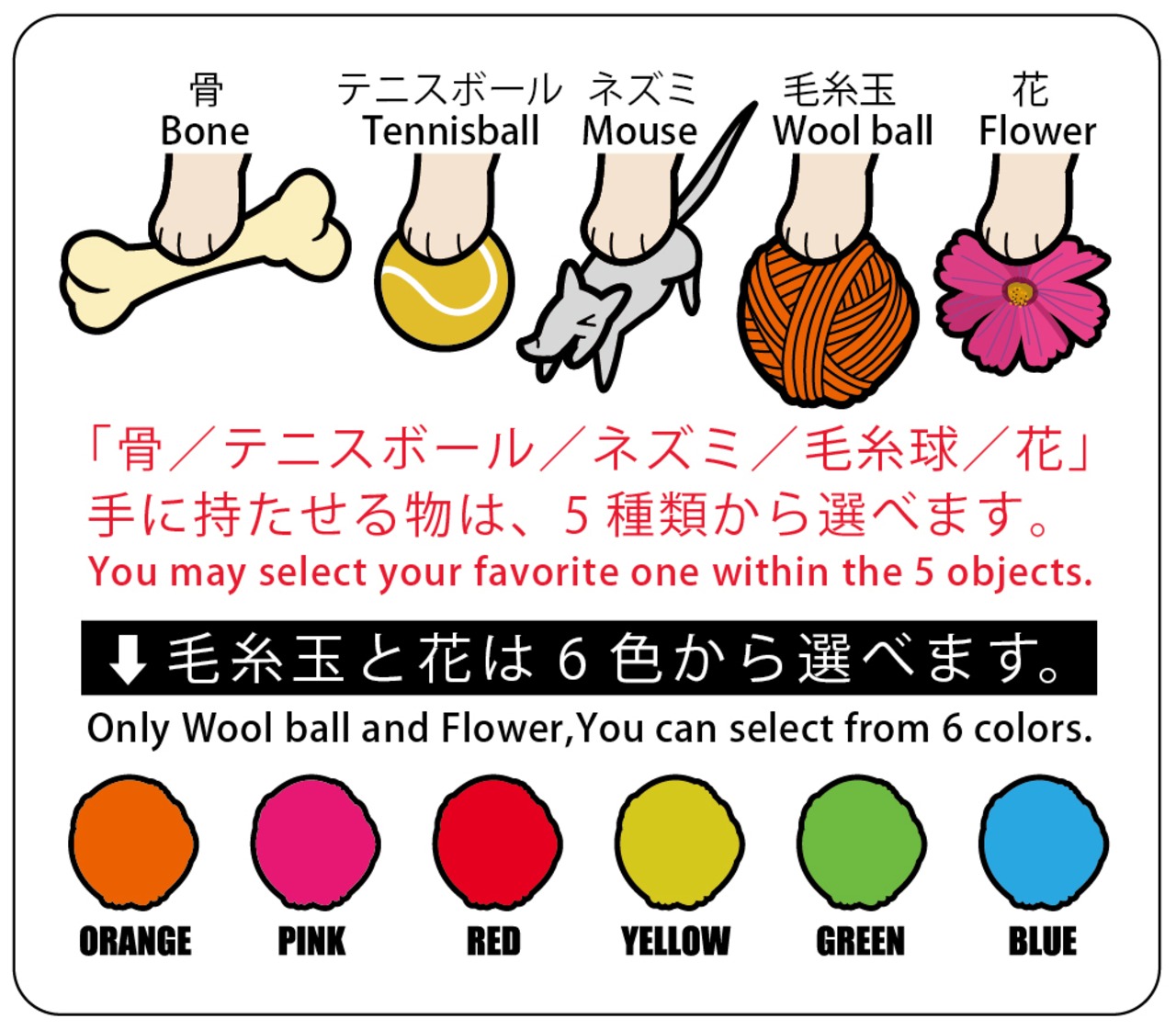 ご注文時にお知らせ頂きますと、手に持たせるものを「毛糸玉・花・テニスボール・骨・ネズミ」に変更出来ます。(毛糸玉・花の色も同時にお知らせください。)